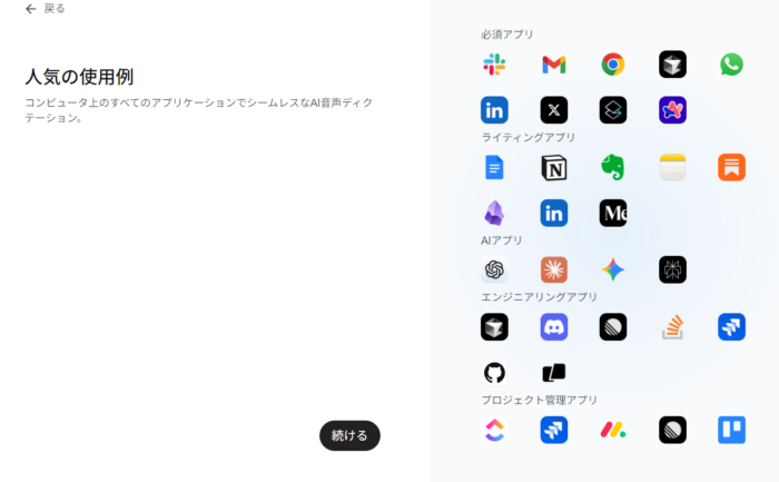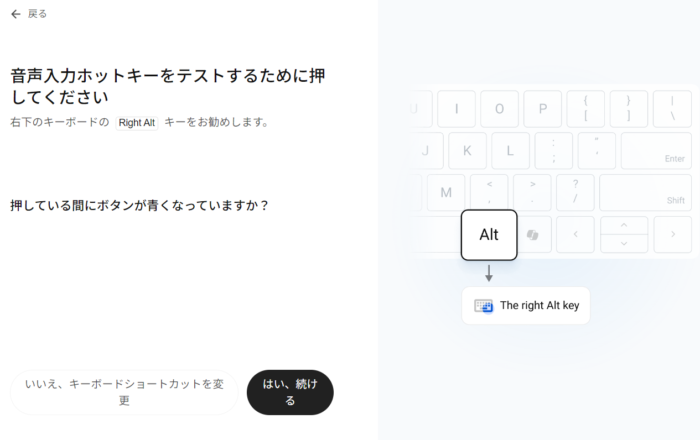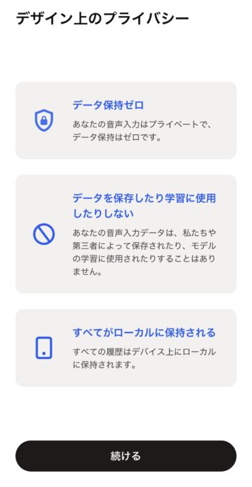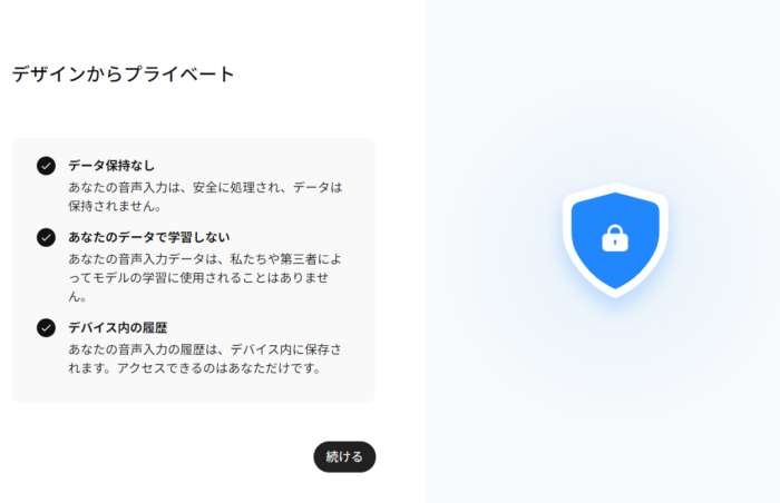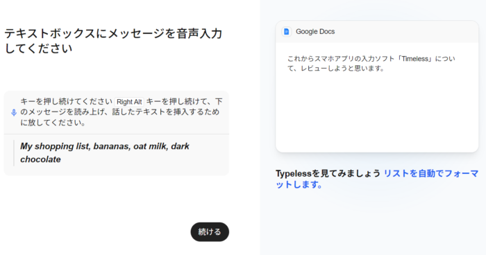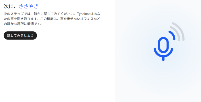 マイクのアクセスを許可します。難しいことはなくTypelessの指示に従っていけば設定は簡単にできます。