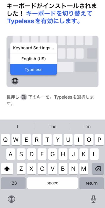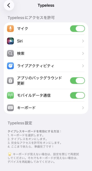 起動しない・キーボードに表示されない→スマホのキーボード設定でTypelessを有効化し、再起動してみる。