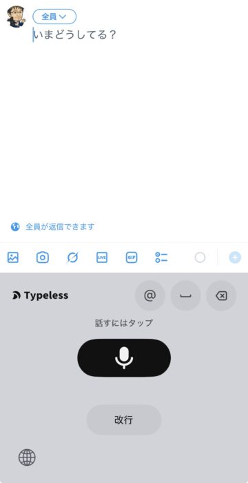 この状態になると、SNSやGmail,noteなどで文章を作るときに既存の入力か「Typeless」かを選択することができます。