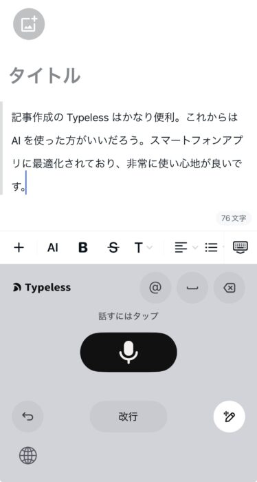 例えば音声で「これからスマホアプリの入力ソフト「Typeless」についてレビューしようと思います」と音声入力しました。