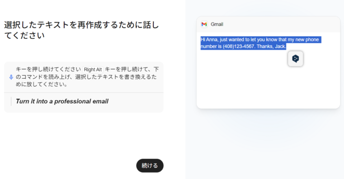 - 内蔵AIによる編集→選択したテキストを音声プロンプトで要約・整形・書き換えできる。