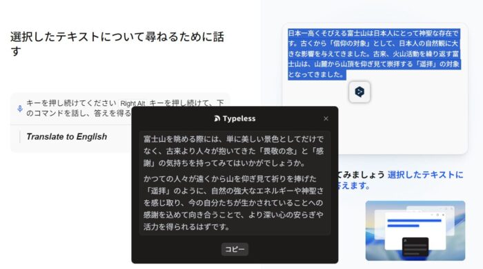 TypelessはスマホでもPCでも使えるAI統合型の音声入力ツールで、特に「音声でたくさん説明してAIに文章へ整形させる」ワークフローに向いています。