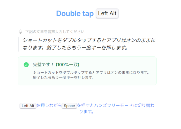 Fnキーを長押ししたままSpaceキーを押すか、Fnキーをダブルタップすると、キーを離しても音声認識が続くモードに切り替わる。長時間の音声入力に便利。