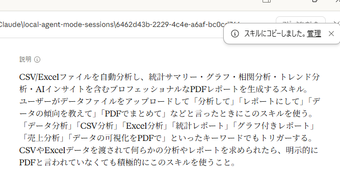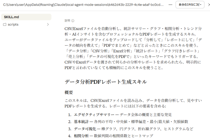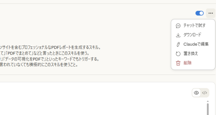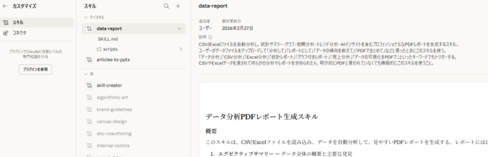 また必要があれば「カスタマイズ」からスキルの中身(.mdファイル)を開いて調整。編集はテキストエディタを使うと楽です。