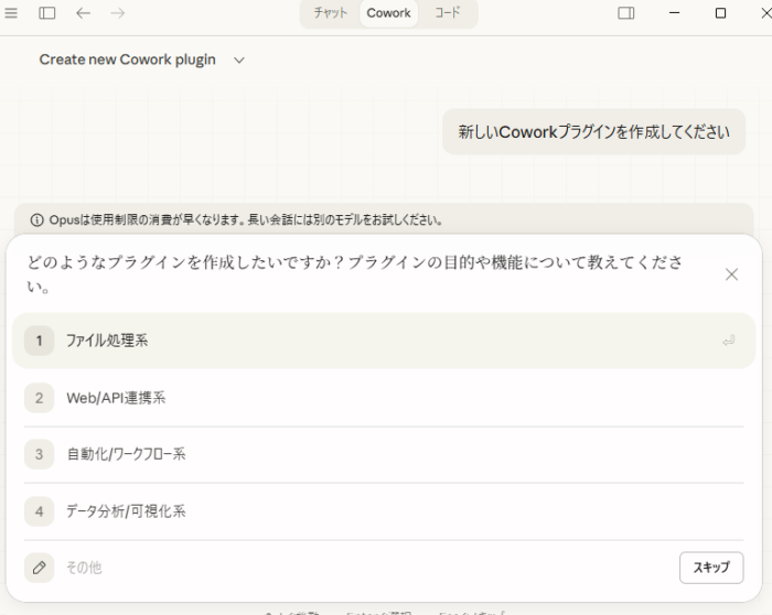 プラグイン作成を促すために簡単な命令を投げる(例:「help me create new Cowork plugin」または日本語で「新しいCoworkプラグインを作成してください」)。