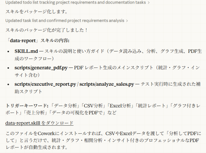 こうして一連のスキルをチェインさせれば、記事を書いて図を生成し、スライドに組み込んでダウンロードするまでが自動化されます。