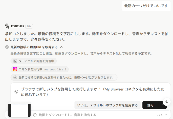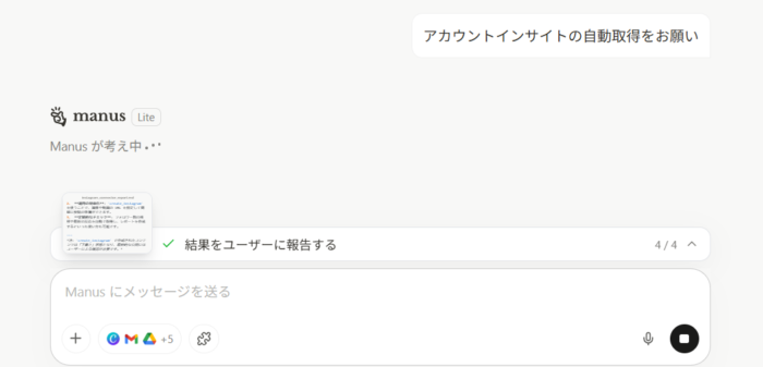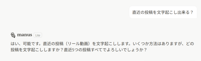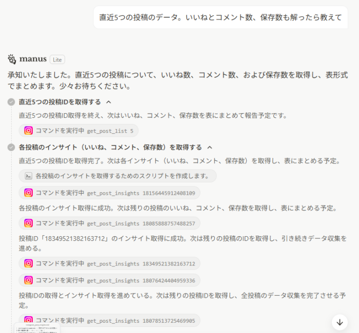 あるアカウントを対象に、直近5本のリールのインサイトの自動取得をManusに依頼。