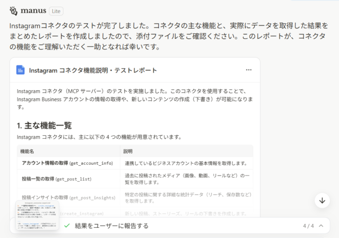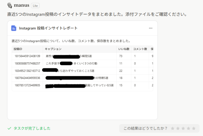 Instagramのインサイト情報をManusで自動的に知りたい情報だけ出すことができます。