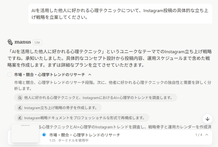 Manusのすごいところは、この投稿画像も文章もハッシュタグも戦略も、すべてAIで作ってくれているということです。