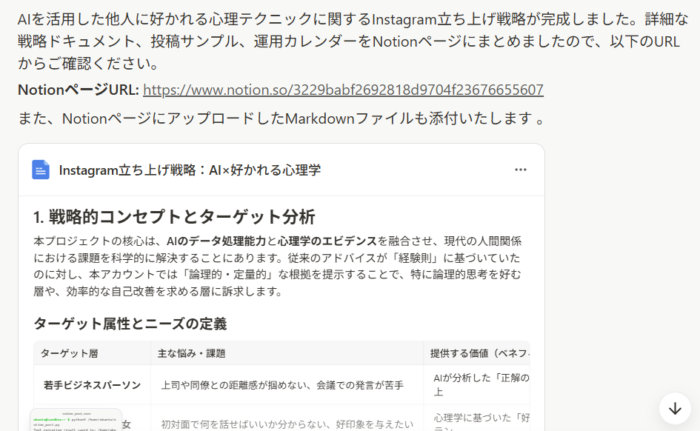 たった一言指示しただけで、これだけのことを分析して計画してくれました。文字数にして2,000文字から3,000文字ぐらいあります。