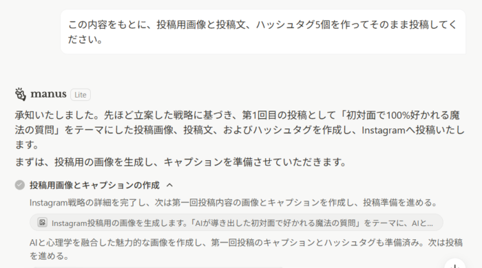 Manusが立ち上げてくれた戦略から、このままAIが投稿画像と投稿文章、ハッシュタグも自動で作ってくれて、投稿まで行ってくれます。