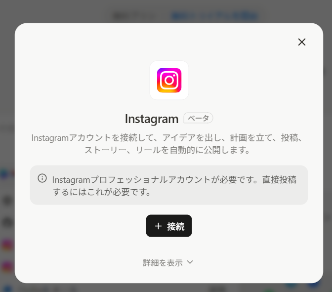 そうするとInstagramが接続可能になっていると思うので、Instagramベータ版を接続。