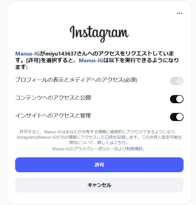 ここからは、ManusとInstagramを連動する方法をお知らせします。