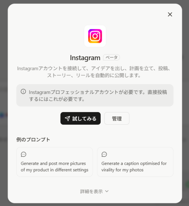 画像生成や指定ファイルからの素材を使ってストーリーやフィード投稿を自動化可能(β段階あり)。